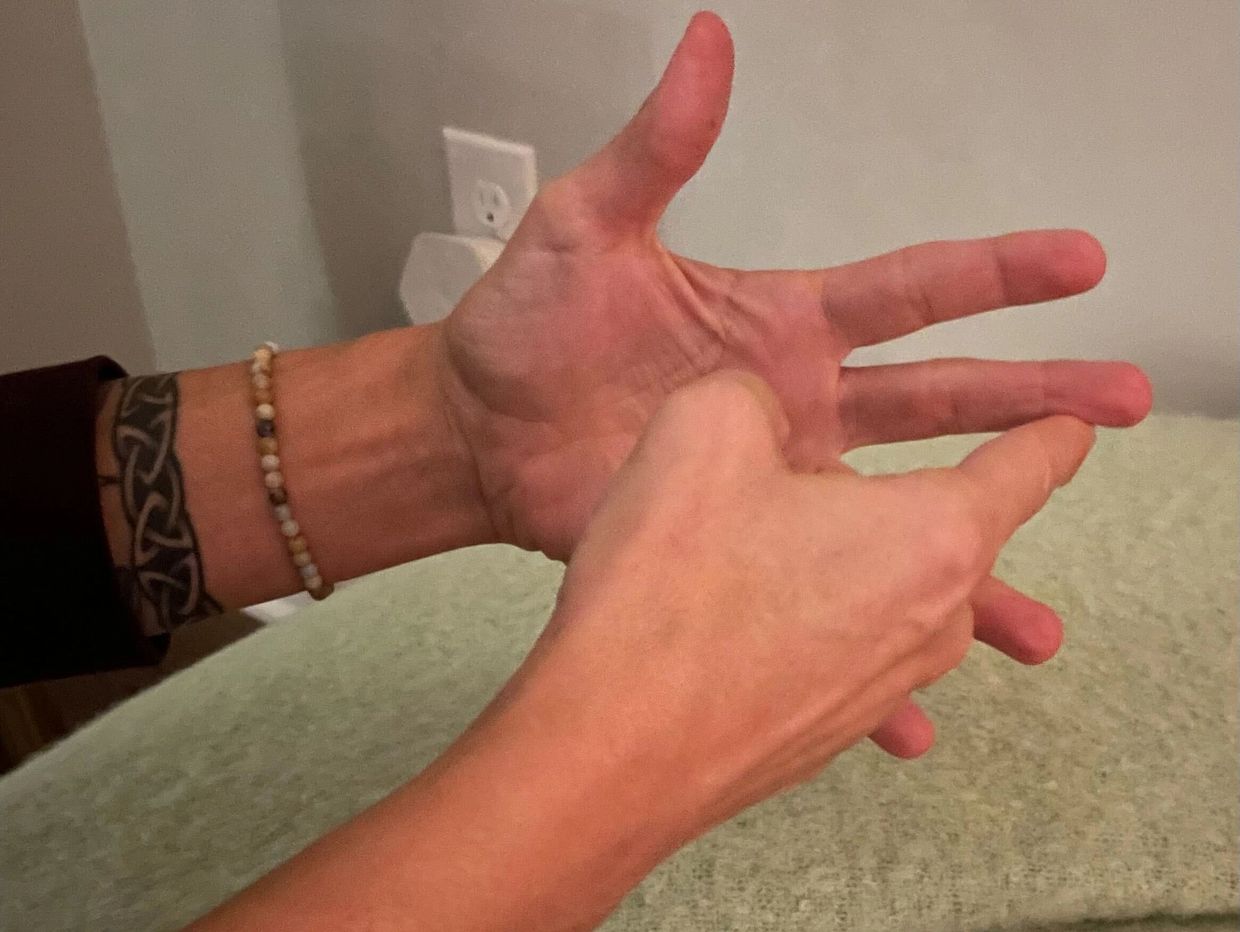 Place the index finger of the right hand at the base of the left hand well below the pinky. Begin to slowly trace the side of the hand, then the outside pinky finger, over the top of the pinky finger, down the inside of the pinky finger.