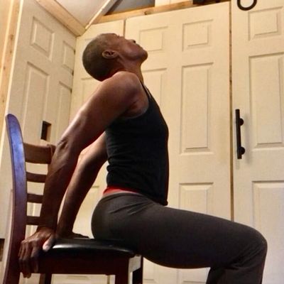 Option 2: While seated, hold the back of a chair where it makes contact near the seat. As you inhale, raise your chest, arch your neck slightly backwards as you look up. Breathe.